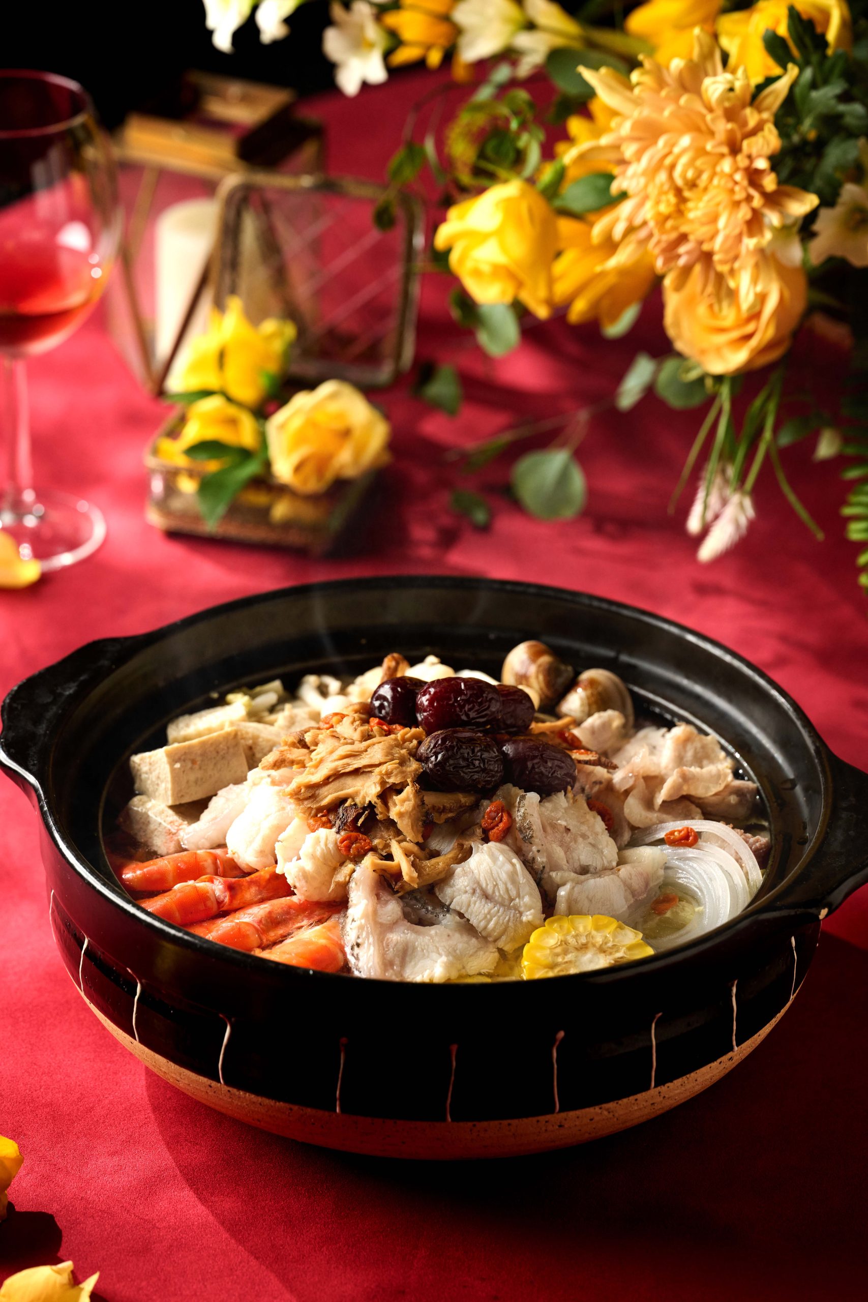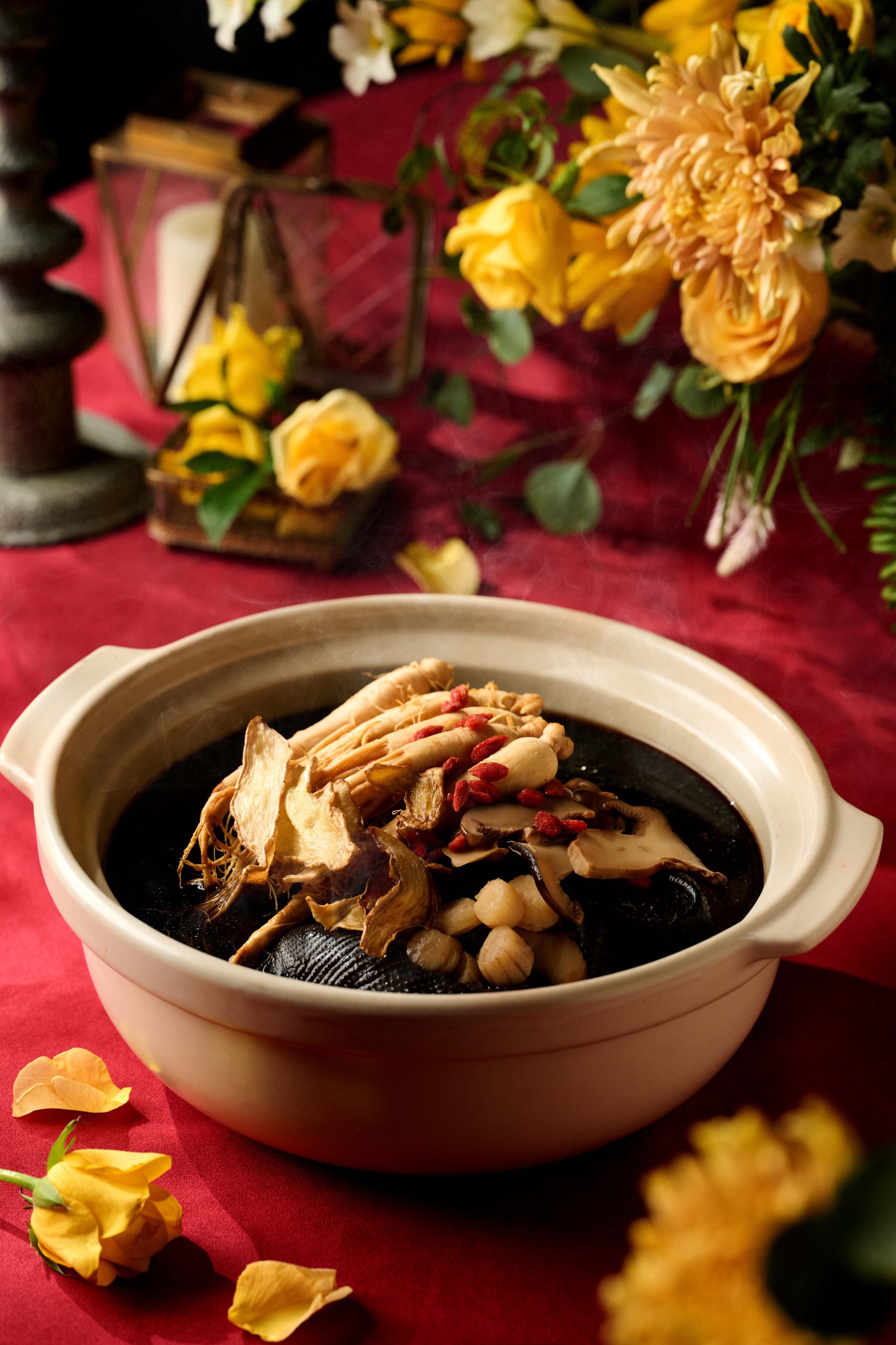 象徵新人”起家”的吉祥祝賀! 選用台灣烏骨雞燉煮3~4小時,搭配富有菇中之王美名的松茸菇,與中藥材結合燉煮入味,湯頭溫潤甘甜!