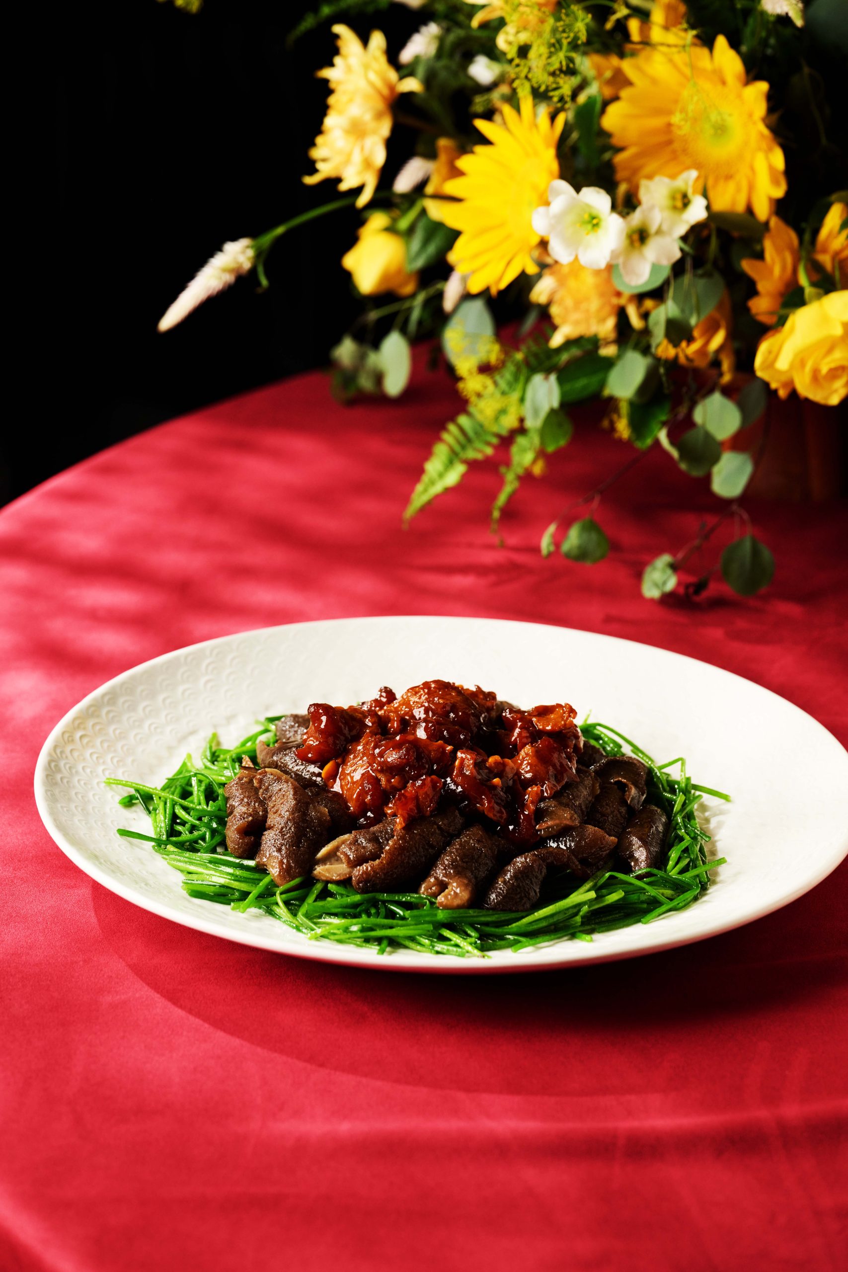 將口感極富嚼勁的九孔鮑魚與紅黃甜椒及菌菇下去與蠔油燜煮,除了有豐盈的鮮味,並且混合了蔬果清香,在視覺與味覺上都顯得十足討喜落落大方!